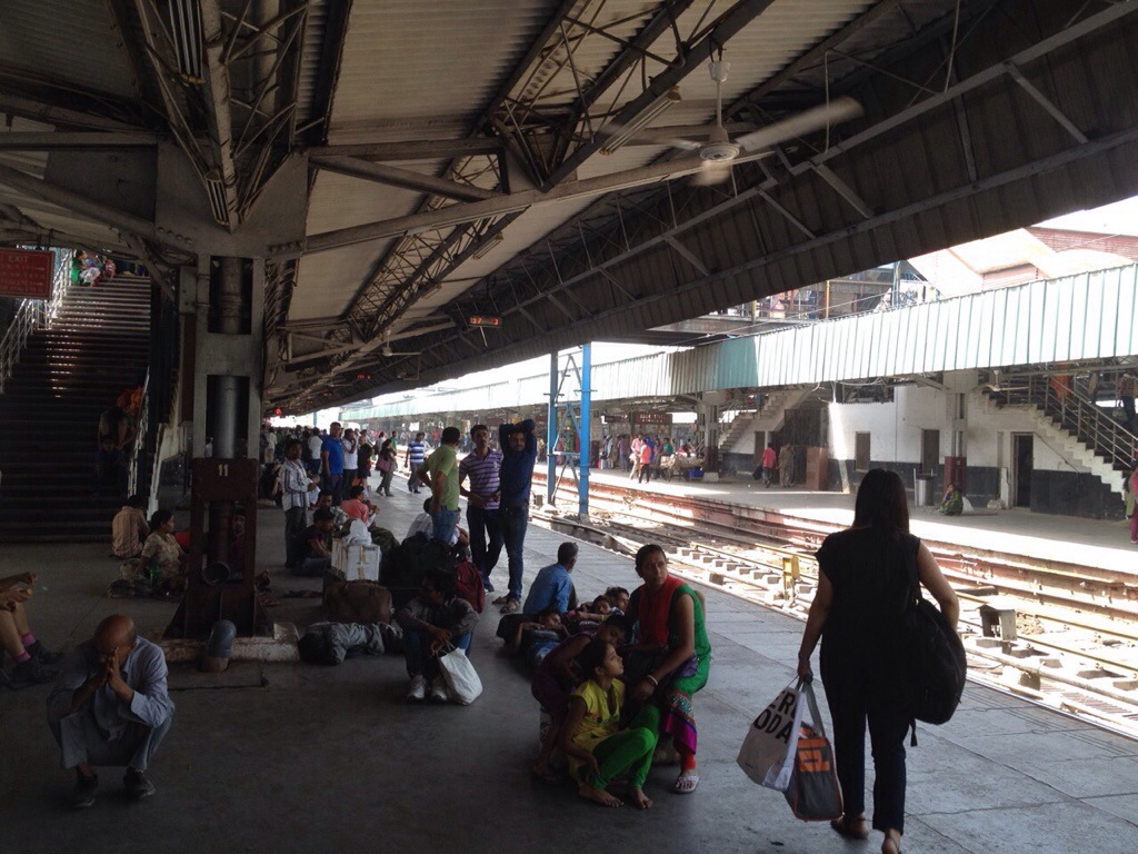 どうせ列車は遅れるだろうと思いつつもホームには30分前に到着。ホームにはインディアンスタイルで電車を待つ人達。